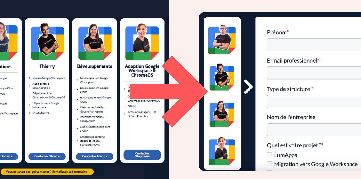 Numericoach avait un gros problème ⇒ leurs prospects devaient faire un choix directement sur le site pour savoir à quel expert parler. Et qui dit choix, dit baisse de taux de conversion.